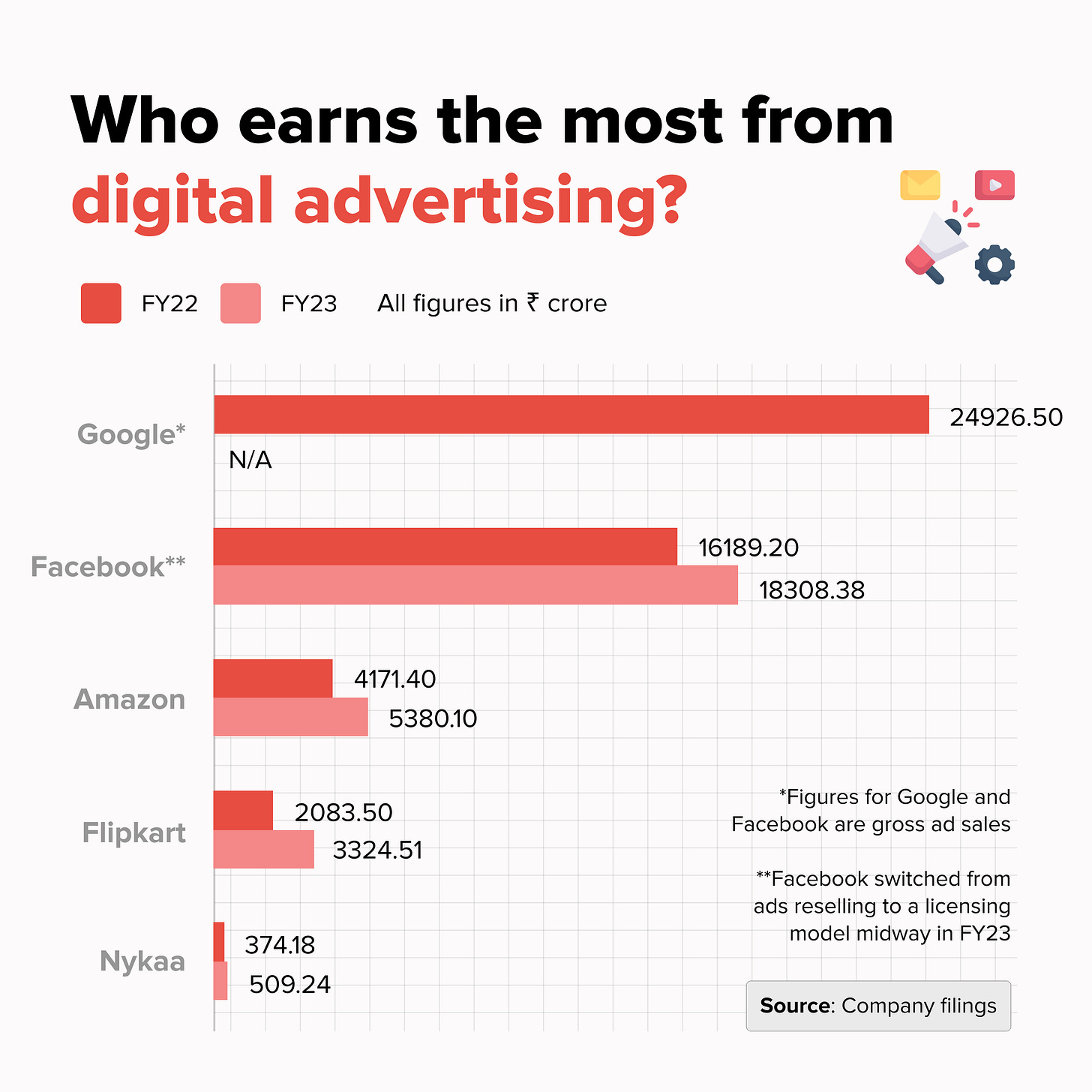 In FY22, Google and Facebook earned more from selling digital ads than Amazon, Flipkart, and Nykaa did put together. Google India is yet to file its results for FY23, but globally, its parent firm Alphabet reported (pdf) an anaemic 4% growth rate in both YouTube ad sales and Google advertising revenue for the first nine months of this year. Meanwhile Facebook India reported a 13% increase in gross ad sales for FY23, down from its usual pace of growth here.