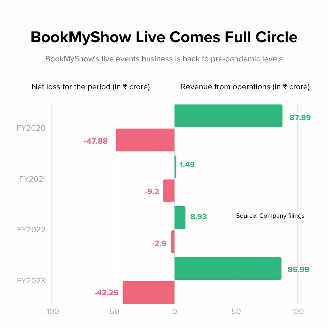 BookMyShow’s live business shrank to a fraction of its size during the pandemic years. Now, in its first full year after Covid-19, the company has bounced back to nearly the same size it was in FY20, just before the lockdown began in India.