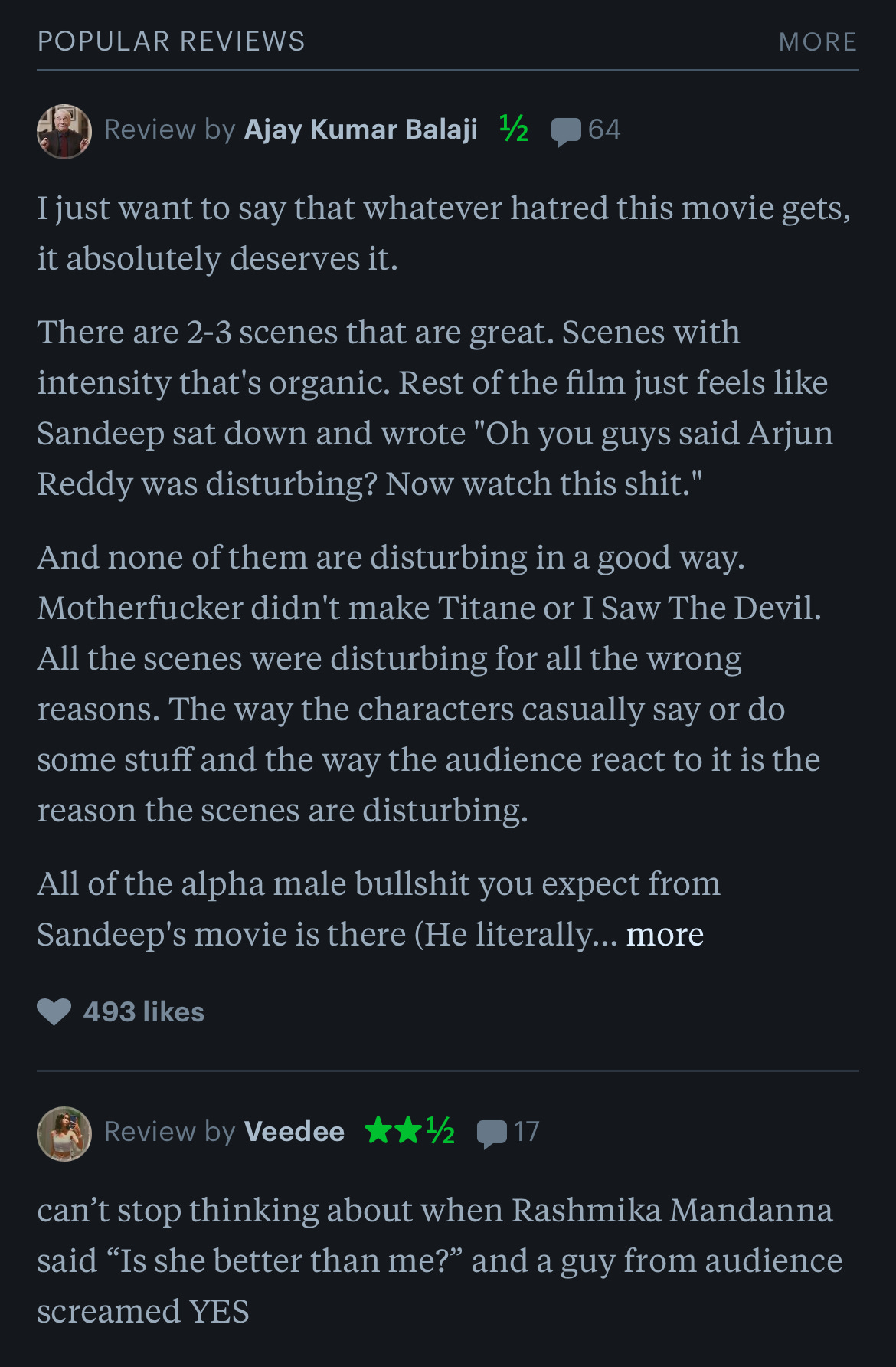 For those of you who are yet to see Animal, I recommend grabbing some popcorn and going through the viral hilarious reviews of the film on Letterboxd instead; they might be more entertaining than the film itself.