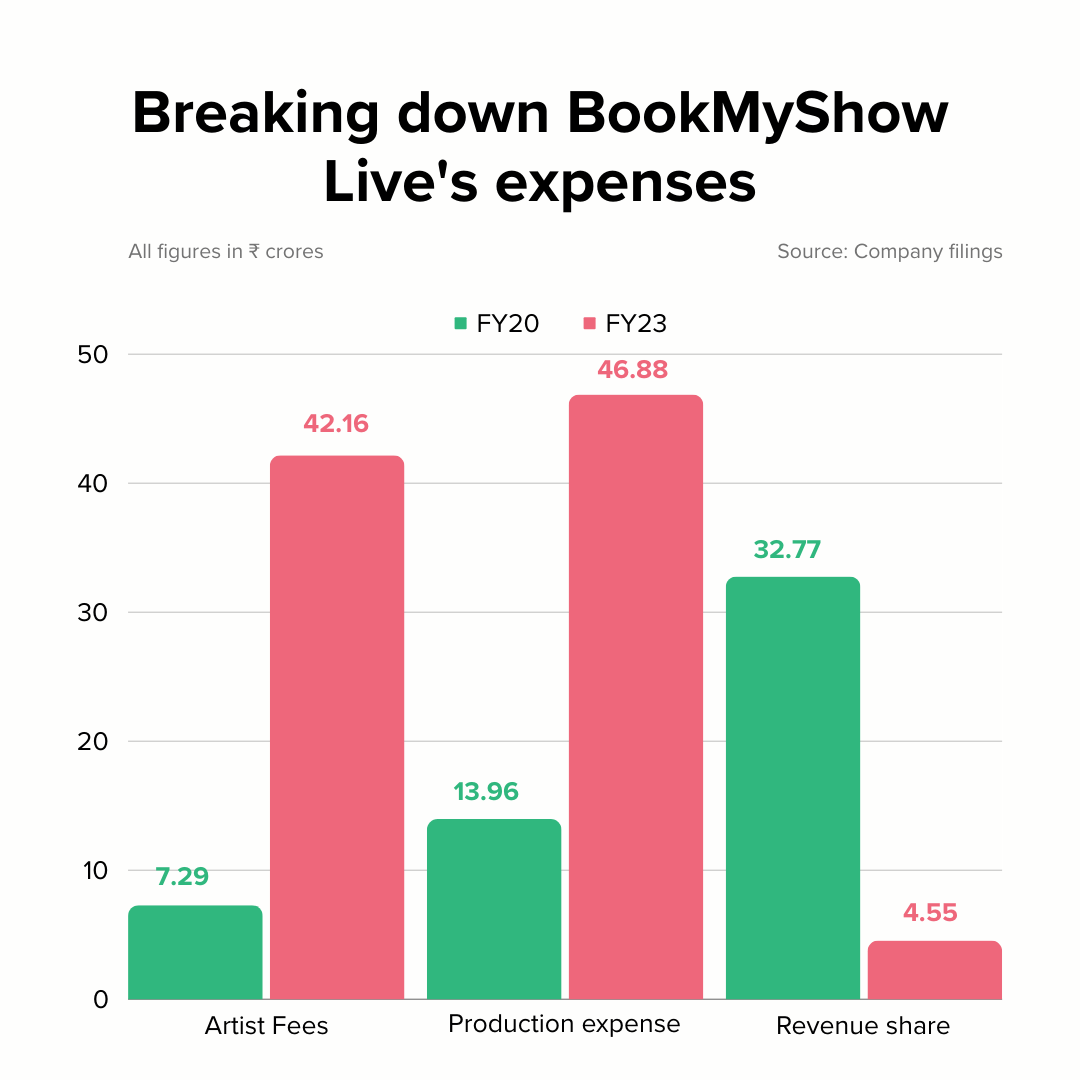 Skip to today, the company is now spending far more on artist fees and production expenses, with a mere 4% of total expenses in FY23 going in revenue share. That ties in well with the kind of shows BookMyShow is putting up now: foreign talent, bigger venues, and more ambitious productions translate to higher costs. The payoff though, is that BookMyShow gets a neat little portfolio of high value IP.